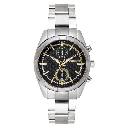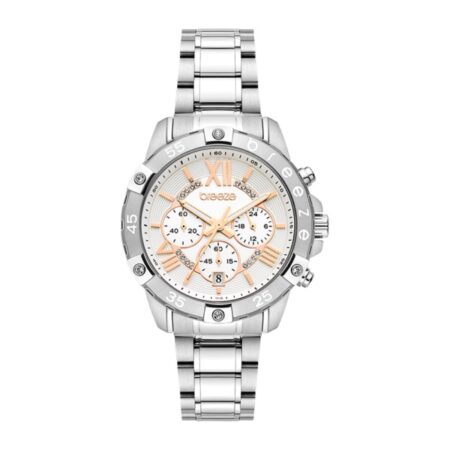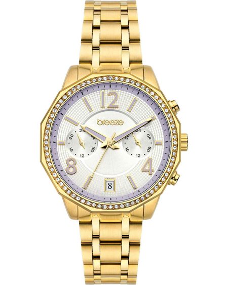Case made of solid high-quality stainless steel (316L) for strong antioxidant protection, excellent shock resistance and amazing shine. 60 Swarovski crystals are placed on the bezel of the case that decorate this particular piece exceptionally. Chronograph with 24h, minute and second indications. Impressive gold dial with metal hour indicators, metal frames on the chronograph indications and Arabic indication at 12h. Embossed logo on the dial plate. Solid gold-plated stainless steel bracelet. Double safety clasp and screw-down crown with embossed "b" of the logo. Water resistant to 100 meters (10 ATM).