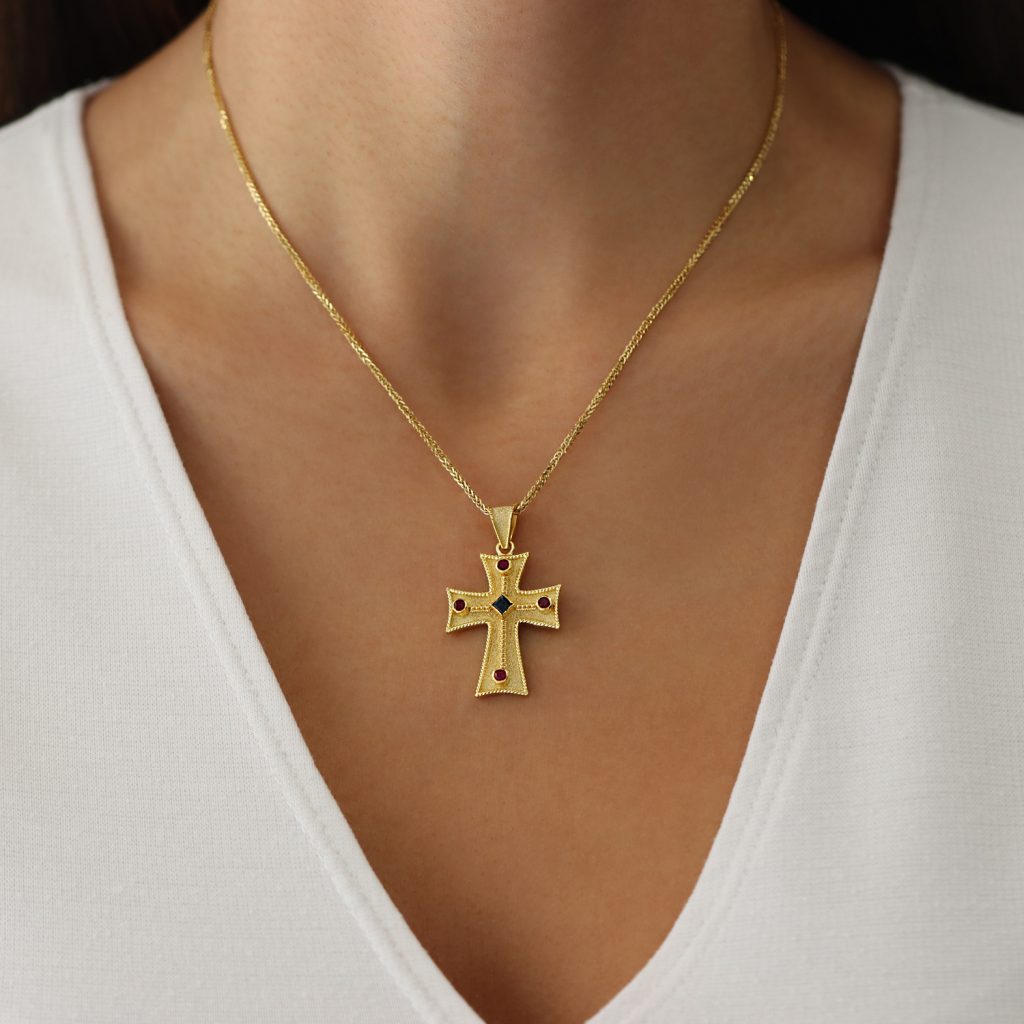 Byzantine Cross in 18K Gold with Sapphire & Rubies