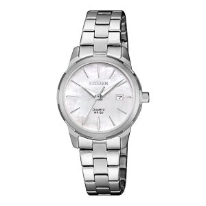 TypeWatchBrandCITIZENModelLADIESGenderFemaleOccasionCasual, Wedding, Business Present, FormalMovementQuartz-BatteryCrystal TypeMineral crystalCase ShapeRoundCase ColorSilverDial ColorWhiteBand TypeBraceletBand ColourSilverBuckleFolding BuckleFunctionsHands, DateCountry of OriginJapanQuarantee2 Years of Official Dealership