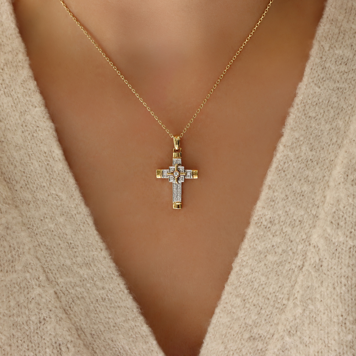 Impressive cross in 18 karat yellow gold with sparkling white diamonds.
