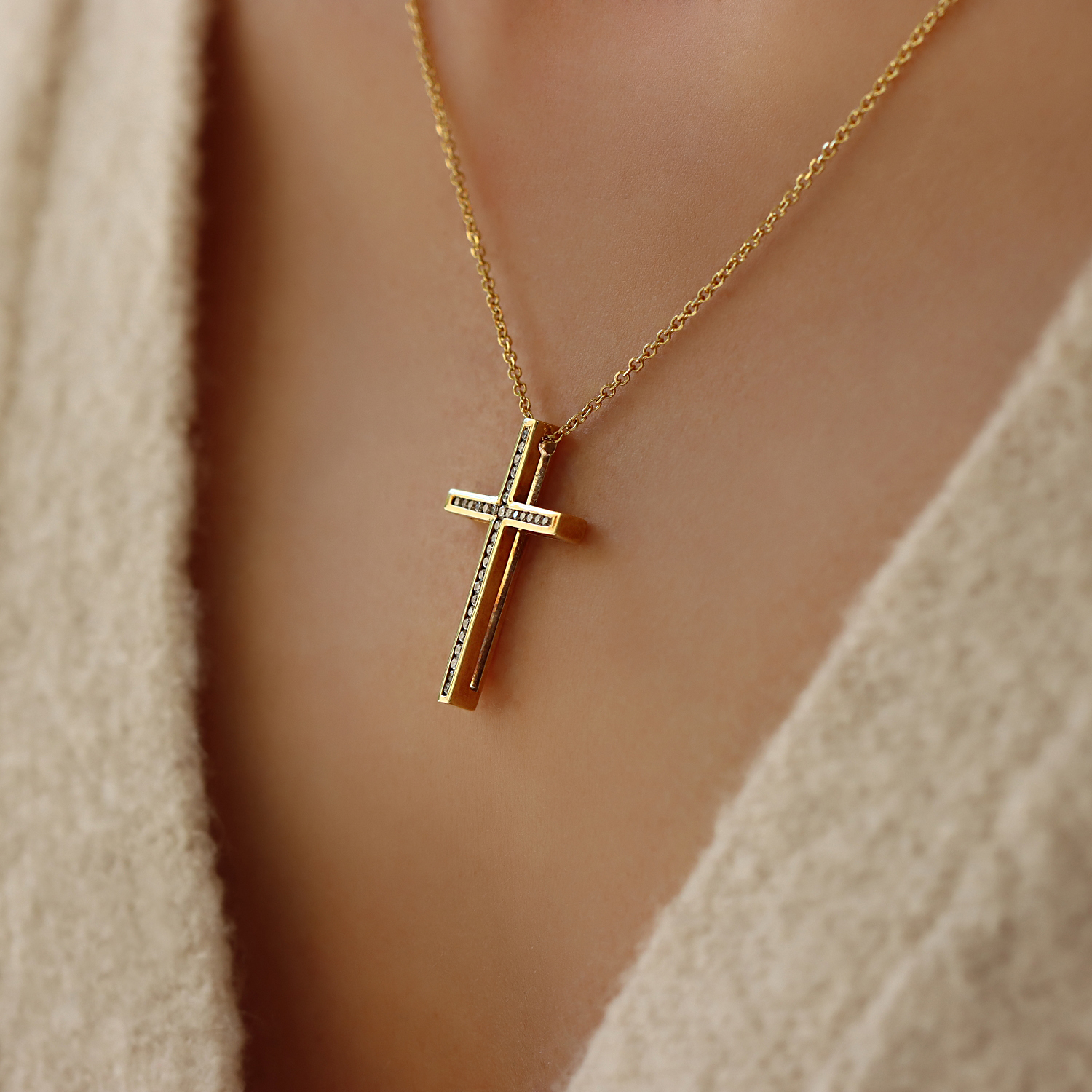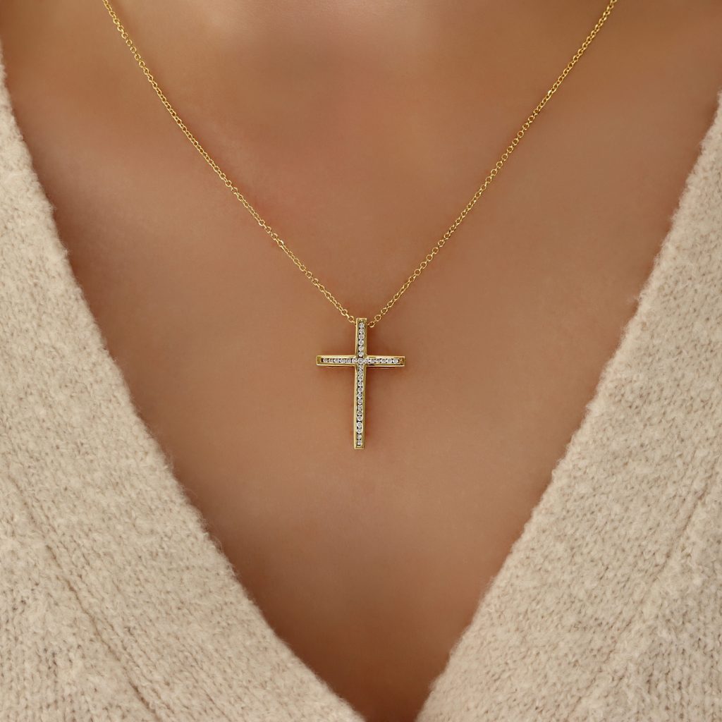 Classic cross in 18 karat yellow gold decorated with white sparkling diamonds.