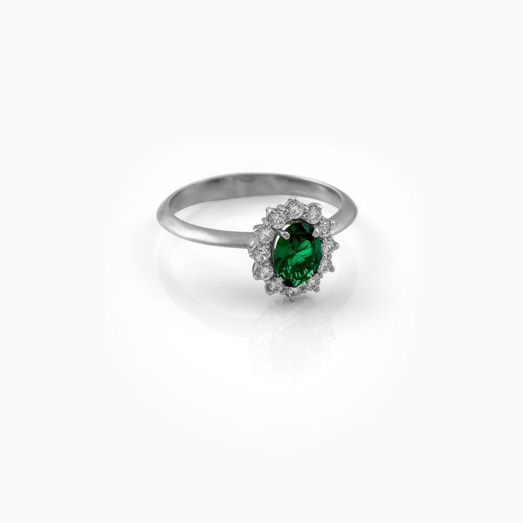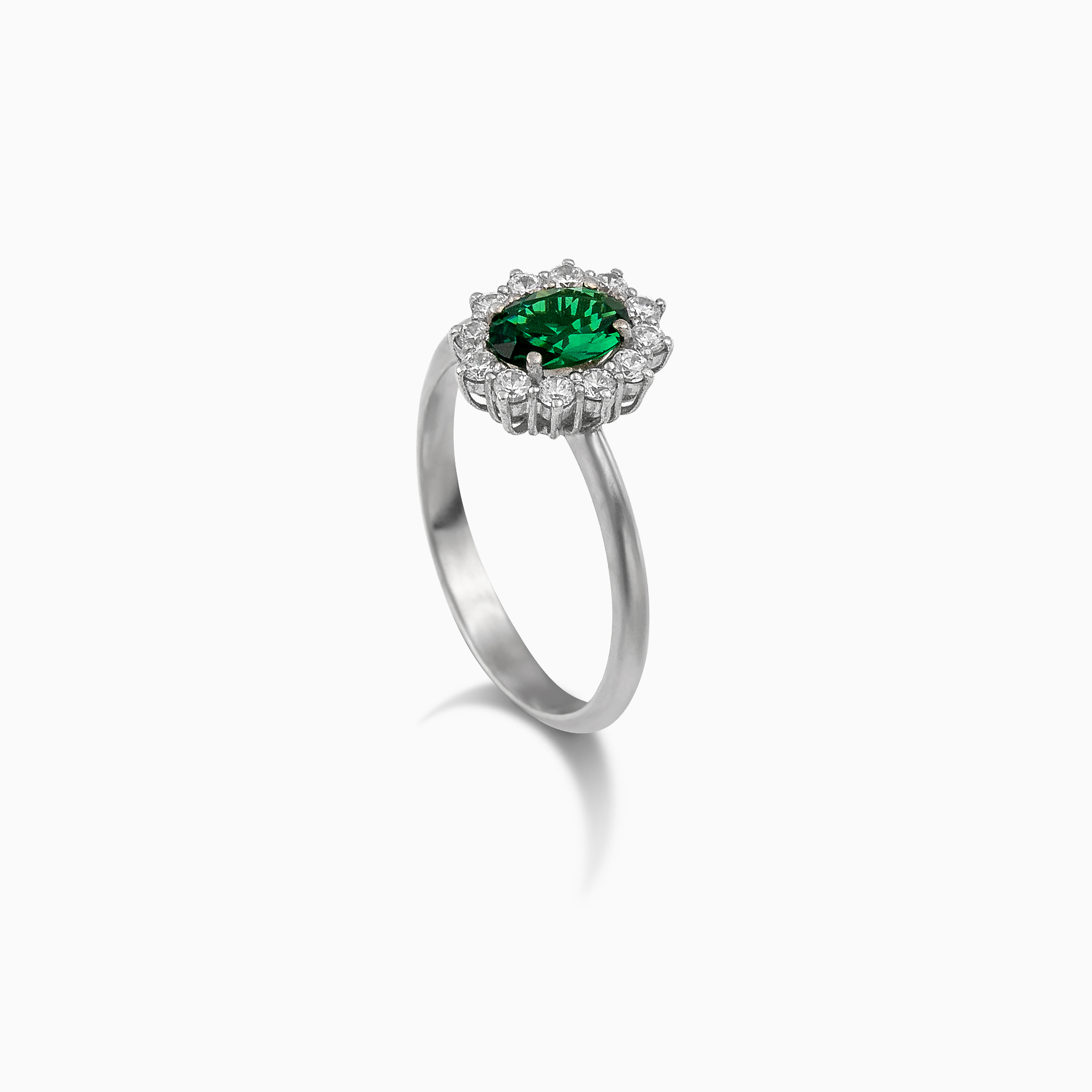 Impressive rosette ring in 18K white gold, with an oval-cut emerald in the center and brilliant white diamonds around its perimeter.