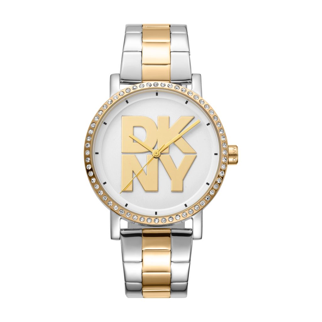 DKNY women's watch, from the Soho Logo collection, with a bezel and bracelet made of two-tone stainless steel. It consists of a silver dial with hands and the company logo in gold. Decorated on the bezel with white crystals, giving elegance and shine to your every look.