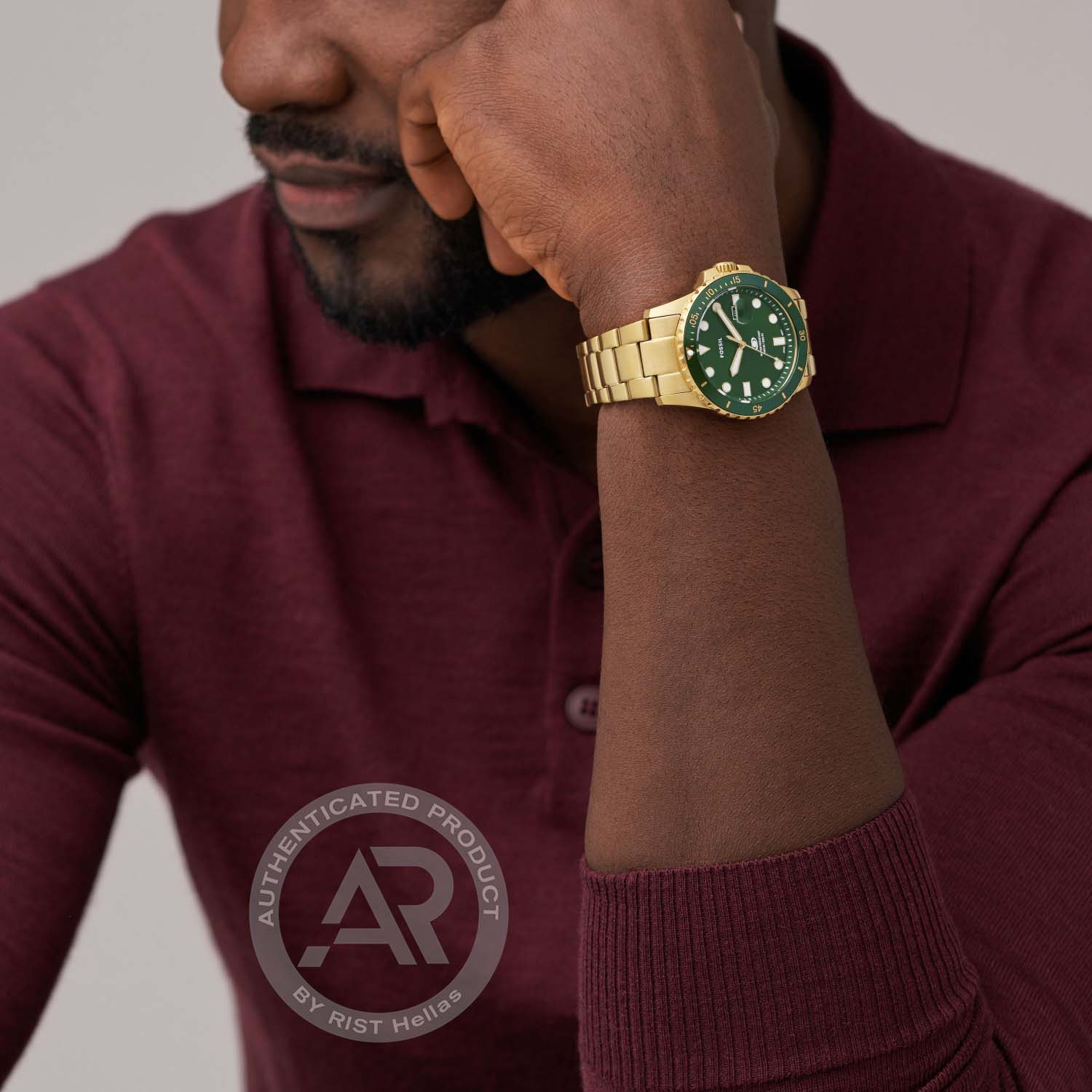 TypeWatchBrandFOSSILCollectionFossil BlueGenderMaleMovementQuartz-BatteryCrystal TypeMineral crystalCase ShapeRoundCase ColorGoldDial ColorGreenBand TypeBraceletBand ColourGoldBuckleFolding BuckleFunctionsHands, DateQuarantee2 Years of Official Dealership