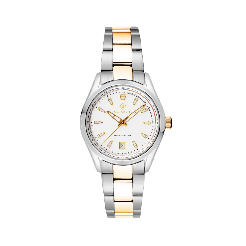 A GANT women's two tone watch from the Amesbury collection with stainless steel case & bracelet and white dial.