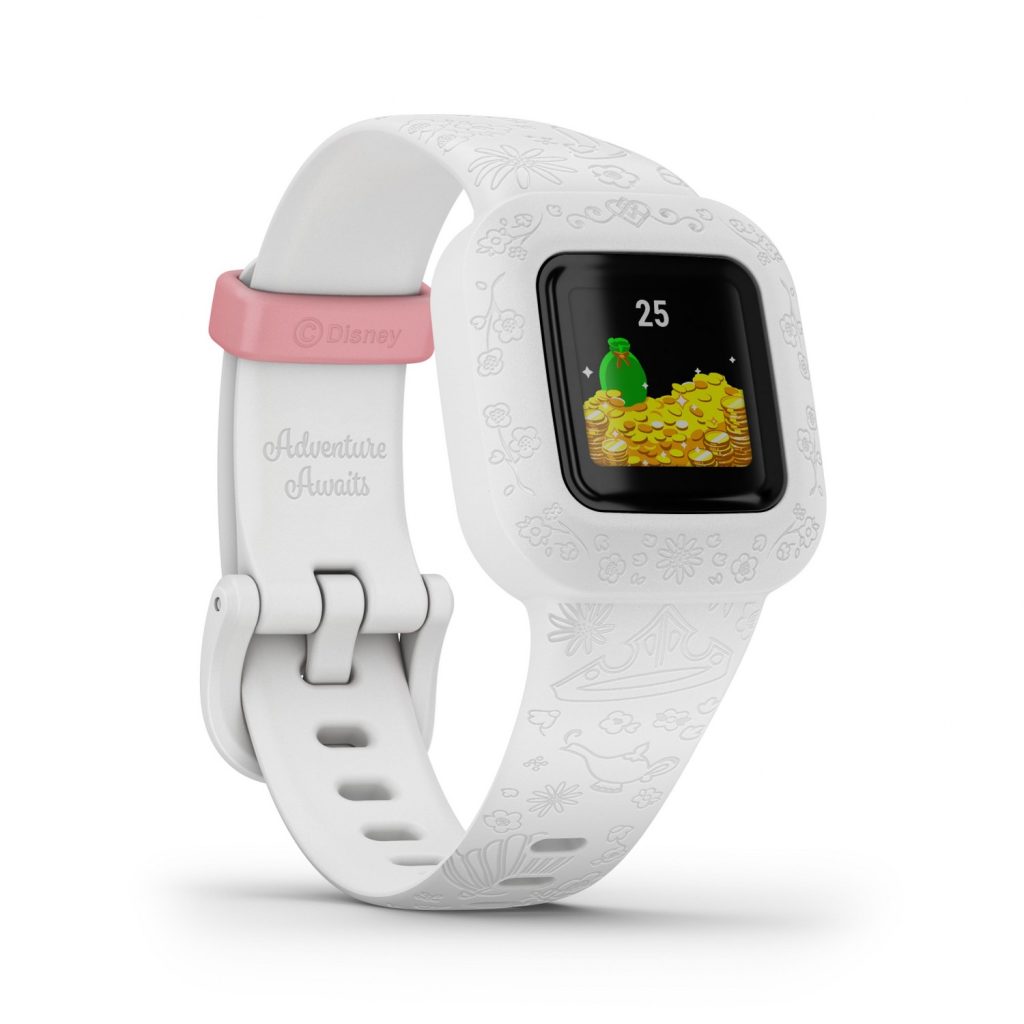 The GARMIN Vivofit® jr. 3 isn’t just a fitness tracker for kids. It’s an interactive experience where your child’s activity unlocks exciting Disney Princess app adventures. This durable fitness tracker is swim friendly — perfect for your kid’s enchanted adventures. No need to stop the fun for charging. This easy-to-replace battery lasts up to 1 year. Your child will be ready for any royal occasion with a color display and multiple watch face options. Parents can use the app to manage chores and give rewards to their little princess. What fun will your child find? Playtime unlocks Disney Princess adventures, games and icons. Track steps, sleep and daily activity. It’s just like magic.