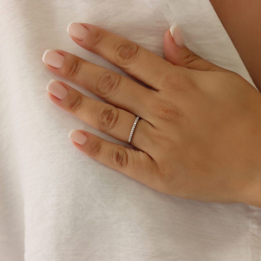 A delicate and subtle eternity diamond ring in 18K white gold, perfect to wear it with your wedding ring or your solitaire ring!