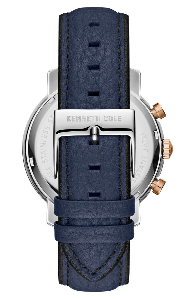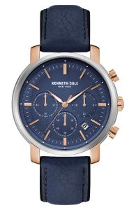A modern casual watch KENNETH COLE NEW YORK CHRONO with a stainless steel case, blue dial with rose gold details and blue leather strap.