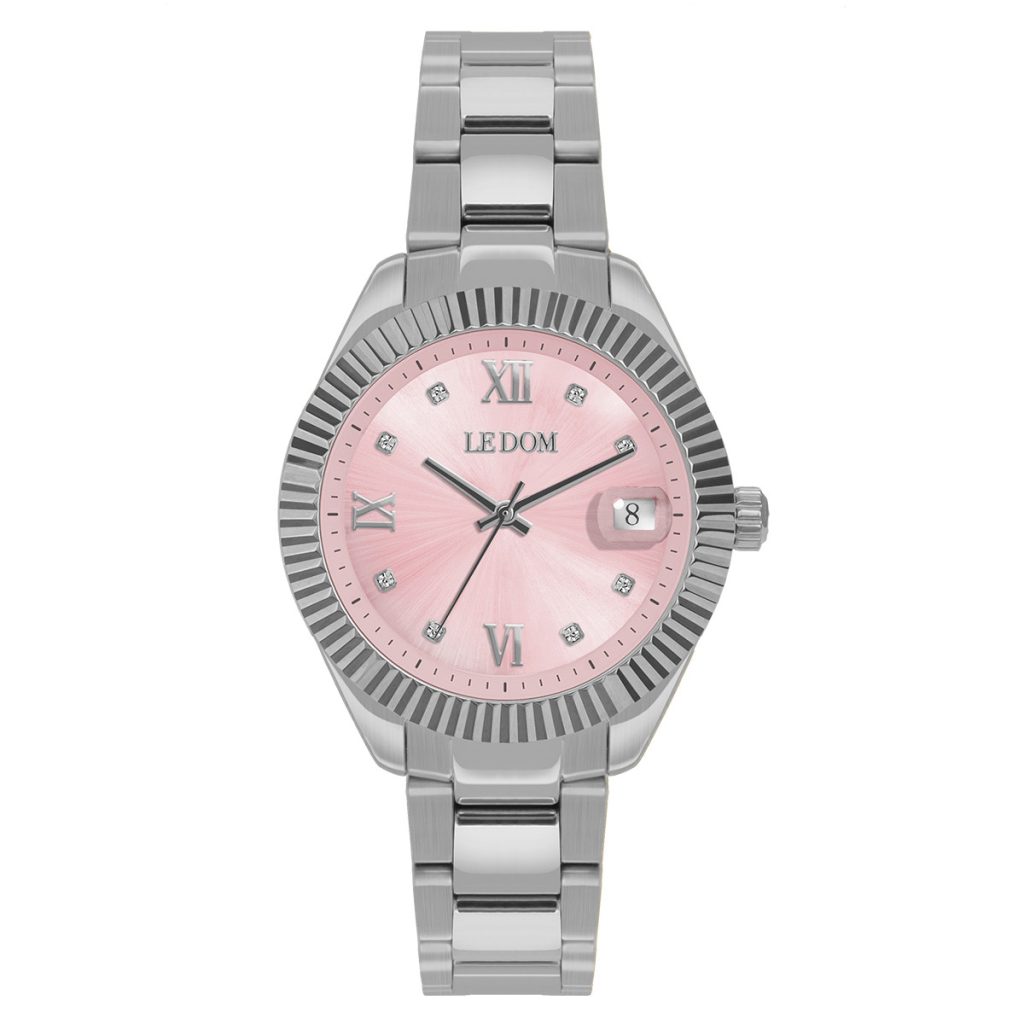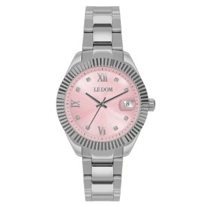 TypeWatchBrandLE DOMModelHARMONYGenderFemaleMovementQuartz-BatteryCrystal TypeMineral crystalCase ShapeRoundCase ColorSilverDial ColorPinkBand TypeBraceletBand ColourSilverBuckleFolding BuckleFunctionsHands, DateQuarantee2 Years of Official Dealership