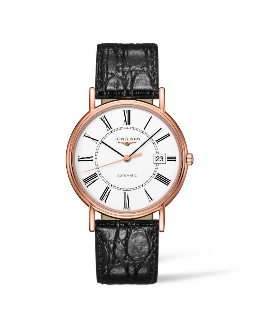 LONGINES PRESENCE classic ladies watch with rose gold stainless steel case, black leather strap and white dial. The Presence collection remains true to the classic, timeless elegance that characterises the Swiss watch brand Longines. Its structured case with understated lines, will delight both men and women alike. Adorned with Roman numerals, its dial pairs elegance with legibility. All of these characteristics come together to make this line an essential part of the Longines collection.