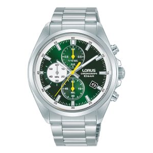 TypeWatchBrandLORUSGenderMaleOccasionCasual, SportMovementQuartz-BatteryCrystal TypeMineral crystalCase ShapeRoundCase ColorSilverDial ColorGreenBand TypeBraceletBand ColourSilverBuckleFolding BuckleFunctionsHands, Date, ChronographCountry of OriginJapanQuarantee2 Years of Official Dealership
