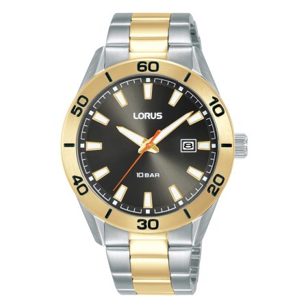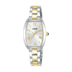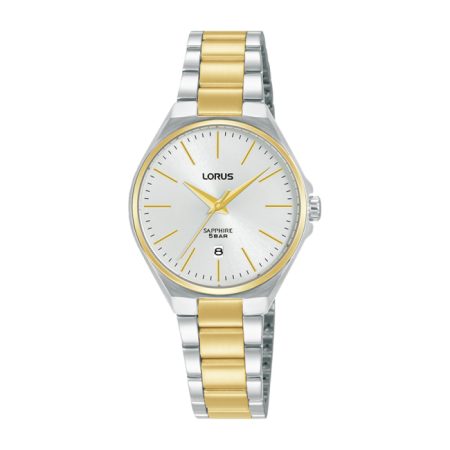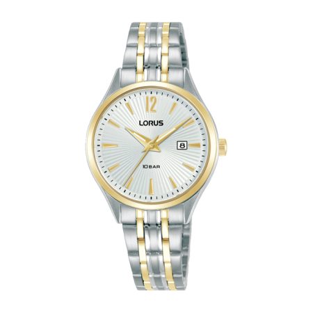 A women's watch from Lorus with a two-tone steel bracelet and a white dial.