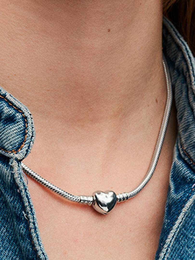 Our classic heart charm meets our iconic snake chain to create the Pandora Moments Heart Clasp Snake Chain Necklace - a tribute to all things Pandora. This snake chain necklace can hold all sizes of the Pandora O Pendant or Heart O Pendant and does not feature threaders (raised charm dividers). Style this sterling silver necklace with your favorite charms for a fully loaded look, or wear it alone as a perfectly simple statement piece.