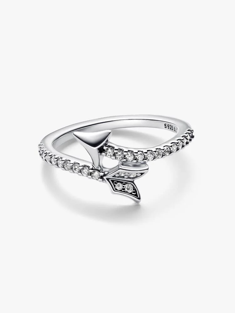 Feeling lovestruck? The Sparkling Arrow Ring features a striking Cupid's arrow motif, crafted from sterling silver. The half-pavé band elegantly mimics the shape of an arrow, complete with a polished tip and curved fletching. Stack it with other minimalist rings for a modern look or wear it solo for a statement piece with subtle symbolism.
