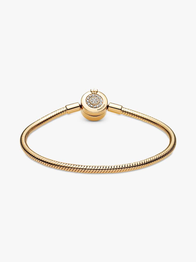 Bring some sparkle to every moment with the Pandora Moments Sparkling Crown O Snake Chain Bracelet. Hand-finished in 14k gold plating the bracelet's clasp features the iconic Pandora crown O monogram and sparkling clear cubic zirconia pavé, while the snake chain brings a chic and modern touch to your wrist. Stack it with other bracelets and load it up with favorite charms for a piece you'll reach for over and over.