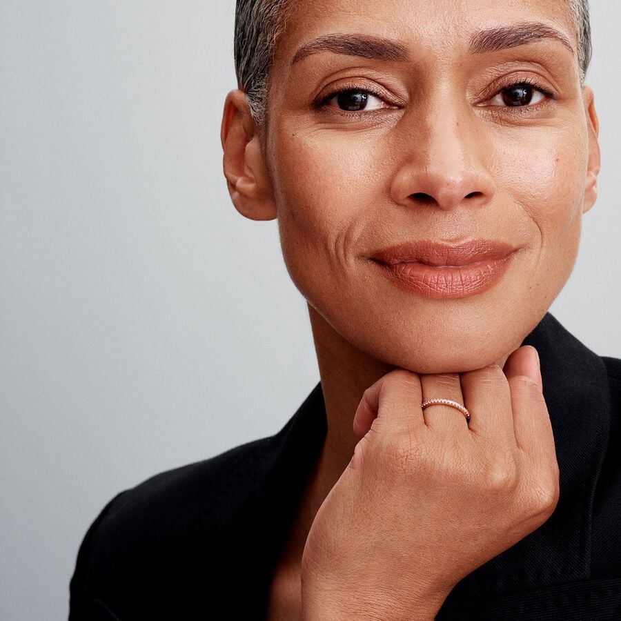 The Sparkling Pink Band Ring features a row of 20 bead-set round pink cubic zirconia set in our 14k rose gold-plated unique metal blend. The outer half of the band is adorned with a pavé motif, adding a playful sparkling finish to the endlessly stackable style. Perfect for adding a touch of colourful to any ring collection.