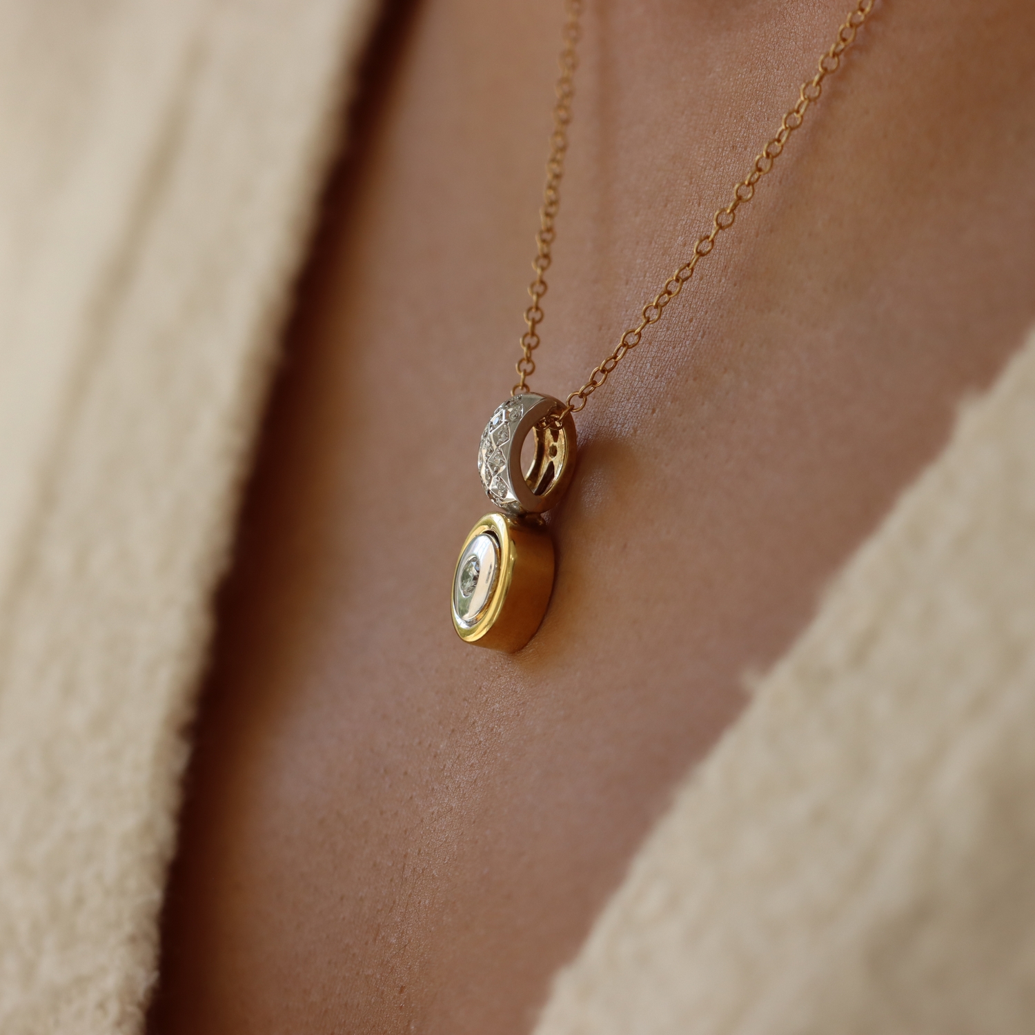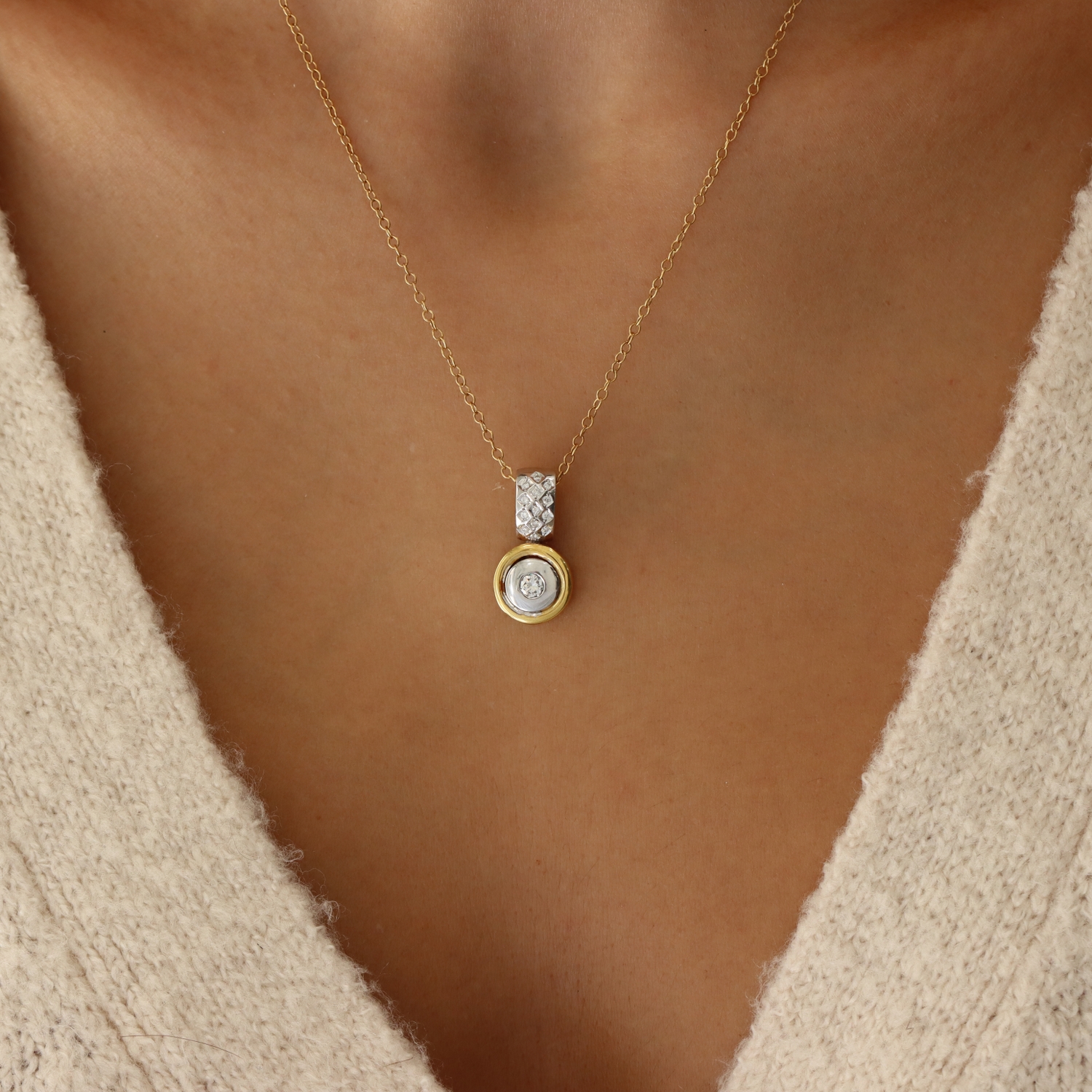 Two-tone pendant in 18K yellow and white gold decorated with sparkling white diamonds.