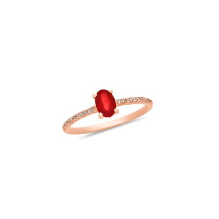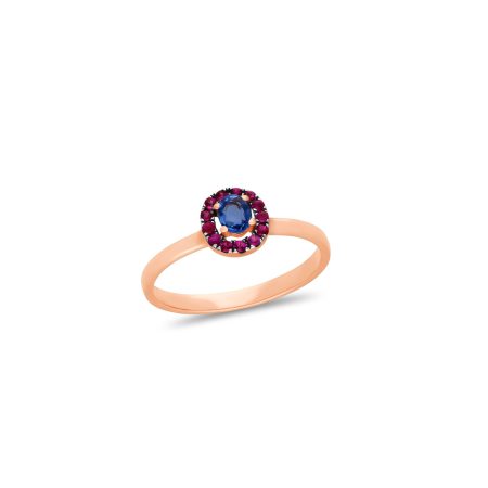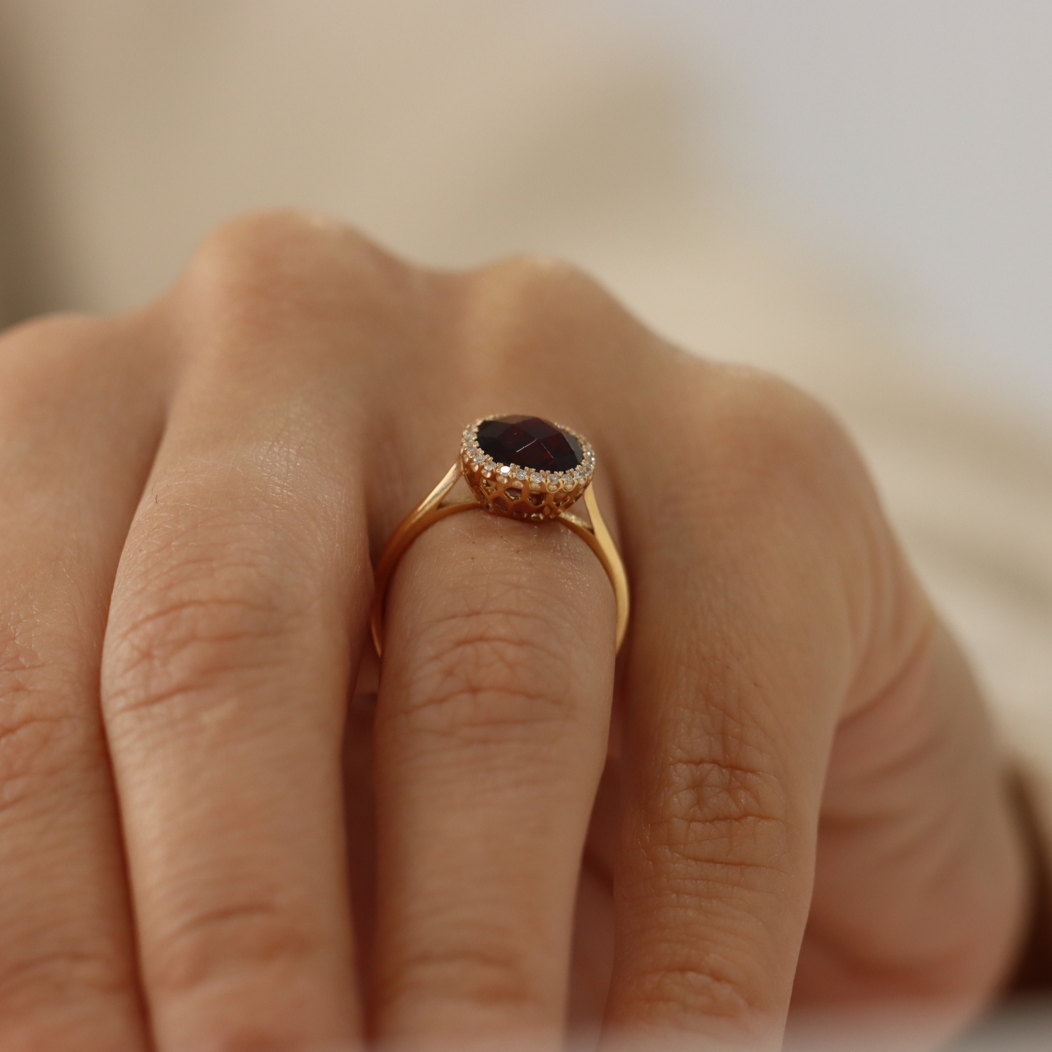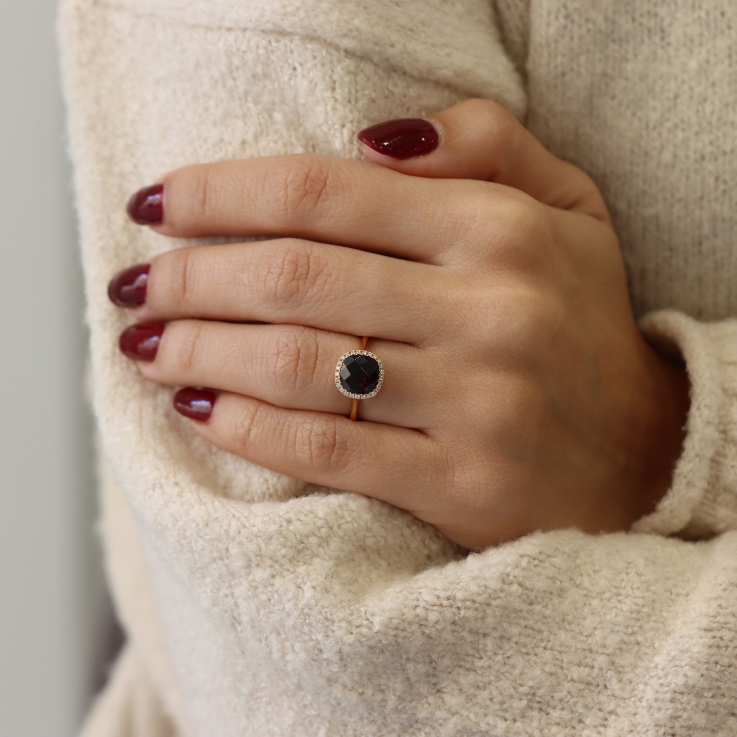 Impressive rosette ring in 18 carat rose gold, with a cushion-cut rhodolite in the center and brilliant diamonds around the perimeter.
