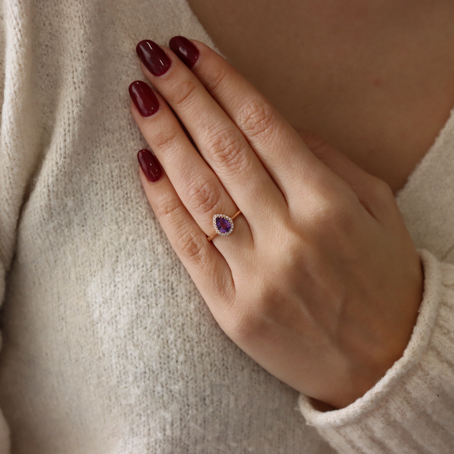 Elegant rosette ring in 18 carat rose gold, with pear-shaped amethyst in the center and white brilliant diamonds around the perimeter.