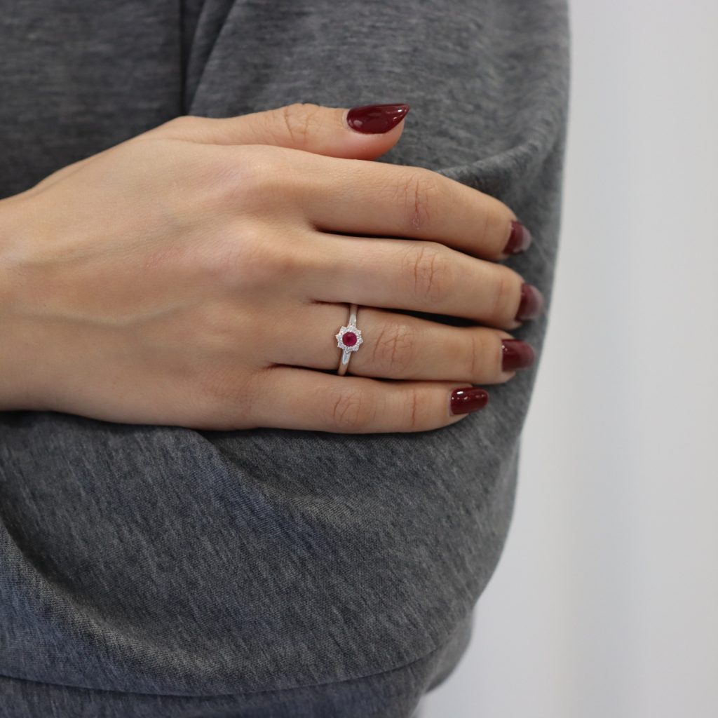 Elegant rosette ring in 18K white gold, with a ruby in the center and brilliant diamonds around the perimeter, forming a daisy.