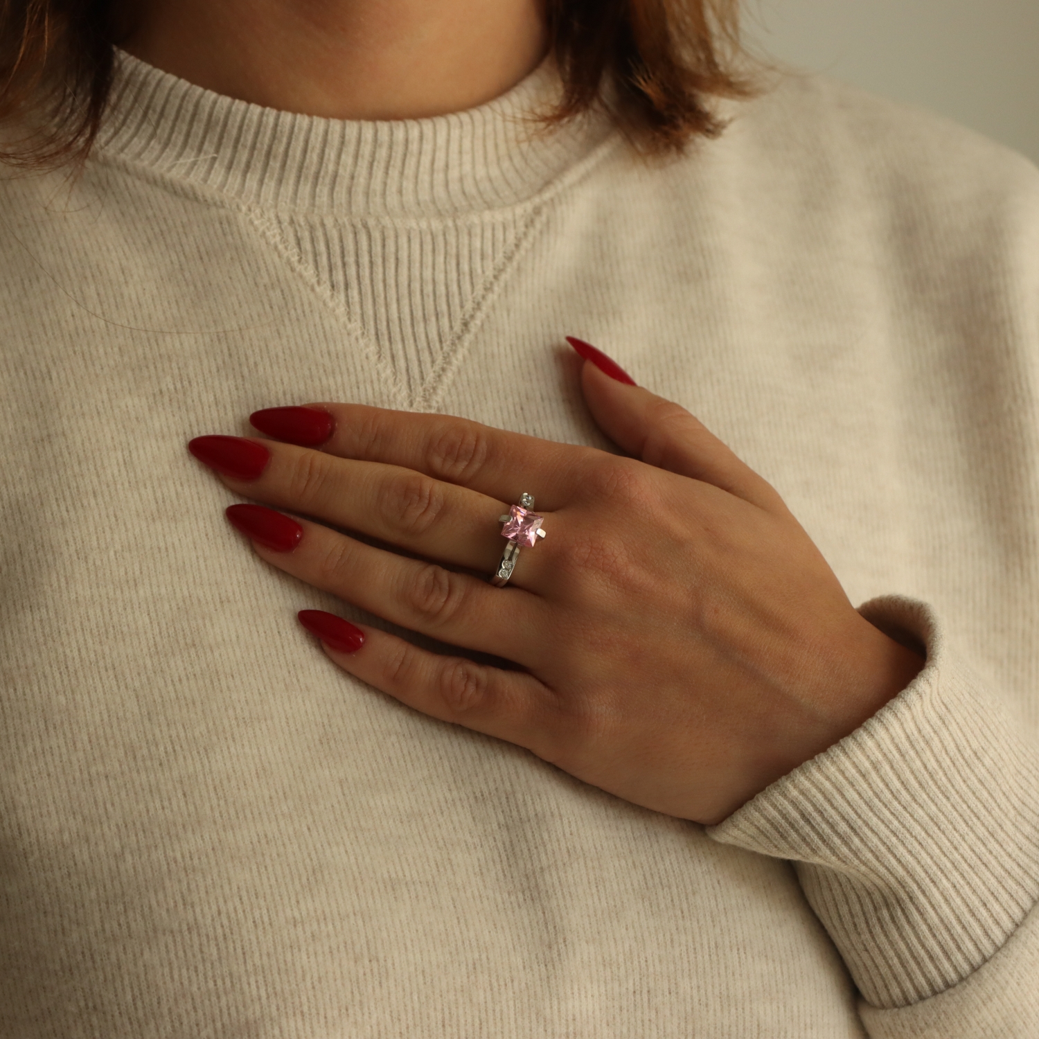 Stunning solitaire ring, in 14k white gold, with square cut pink zircon in the center and white zircons on the sides.