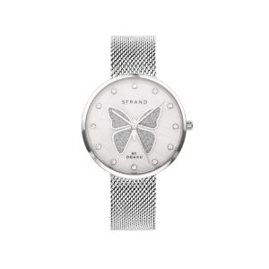 A casual watch from the STRAND BY OBAKU series. Impressive white Mother of Pearl dial with a butterfly design and stones and a stainless steel mesh bracelet.
