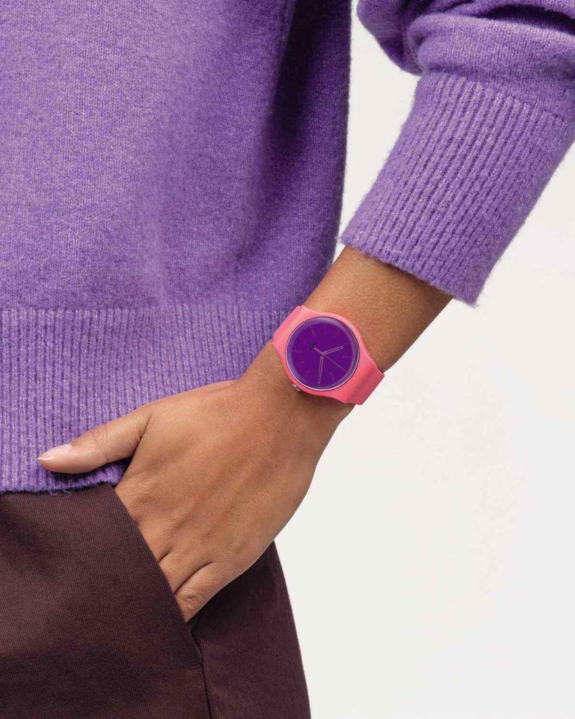 With its polished mirror dial with white hands in a biosourced case and transparent violet biosourced glass, this pink watch with violet buckle and loop features a special engraving technique that gives it a shimmery finish.