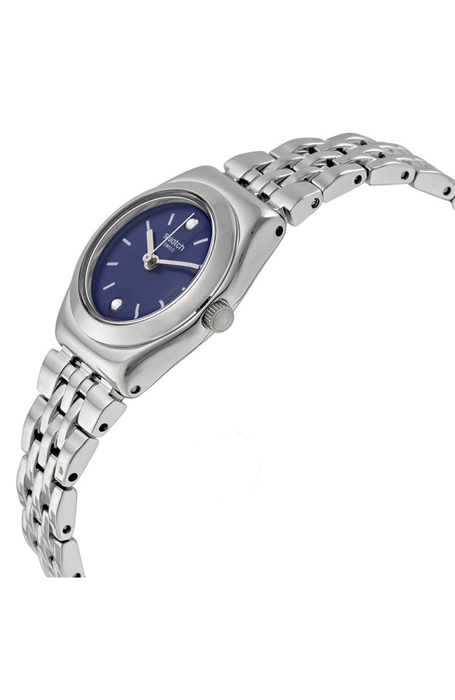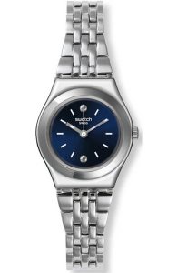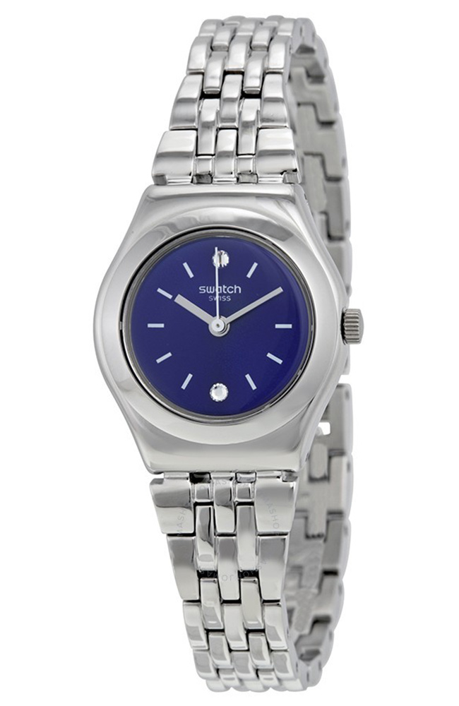 Subtle glamour. Effortless elegance. SLOANE (YSS288G) starts with a blue sun-brushed dial with minimal white indexes and two transparent crystals. Clean and classic, this style is finished with polished stainless steel from bezel to case to the intricately linked adjustable strap.