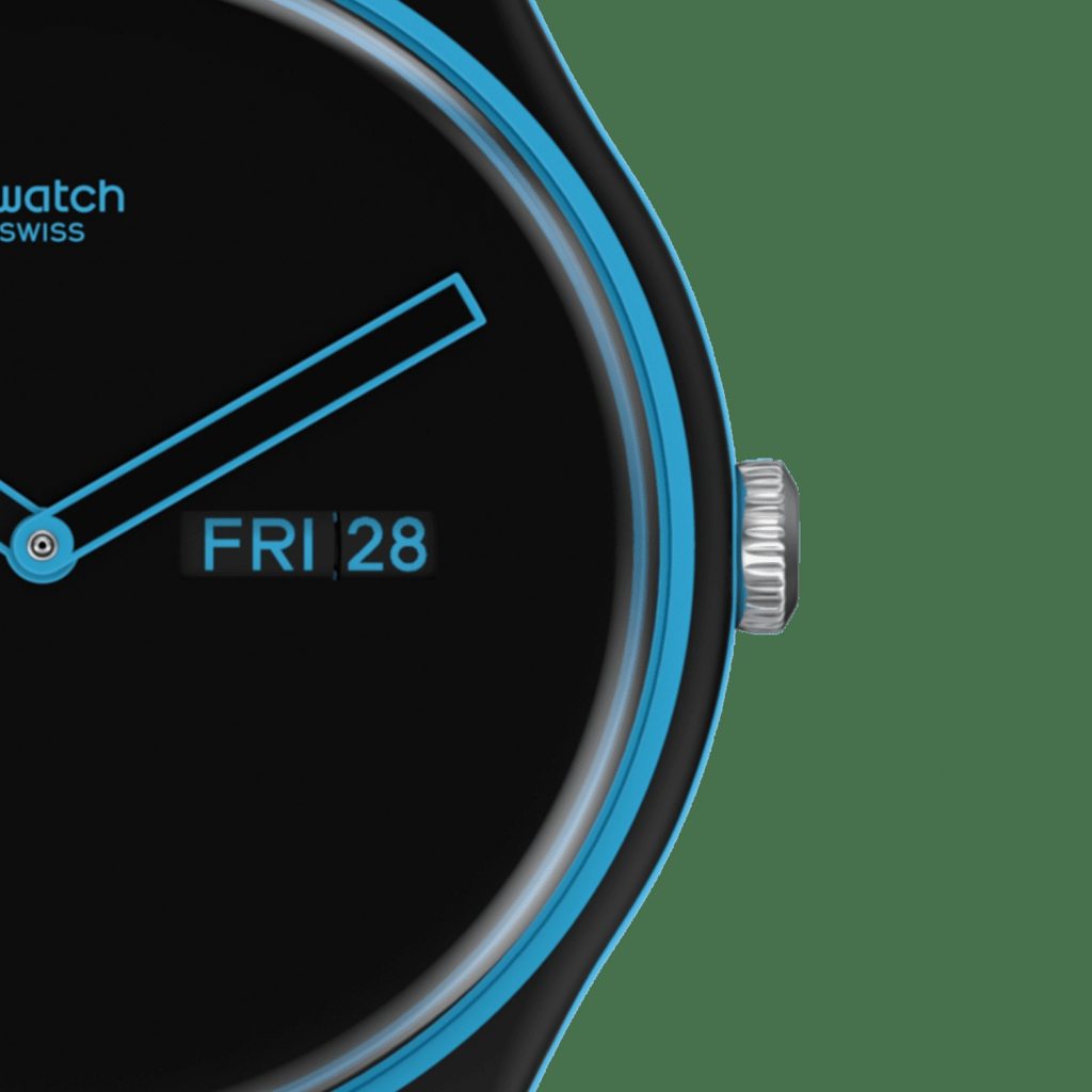 The showstopper of this New Gent BIOSOURCED watch is the glimpse of blue and the 3 o’clock day-date window on the dial. The black print of both the silicone strap and the bio-sourced plastic case and buckle accentuates the solid matte blues on this watch.