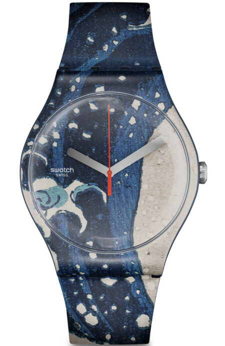 Exhibiting a low-profile ultra-thin Swatch case construction, the white dial features a black and gray print index. The look comes together with a matte white silicone strap, white silicone loop and shiny white plastic buckle.