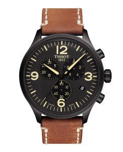TypeWatchBrandTISSOTGenderMaleOccasionCasual, FormalMovementQuartz-BatteryCrystal TypeSapphire CrystalCase ShapeRoundCase ColorSilverDial ColorBlackBand TypeLeather StrapBand ColourBrownBucklePin BuckleFunctionsChronograph, Date, HandsCountry of OriginSwitzerlandQuarantee2 Years of Official Dealership