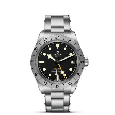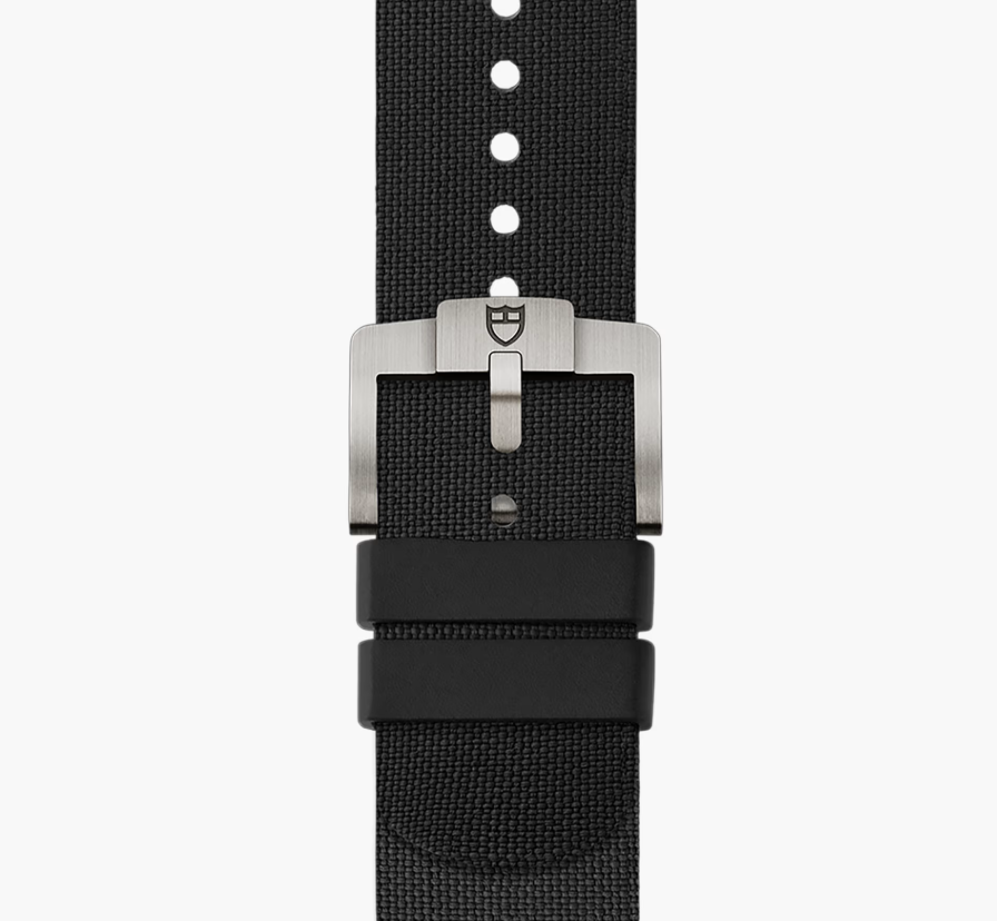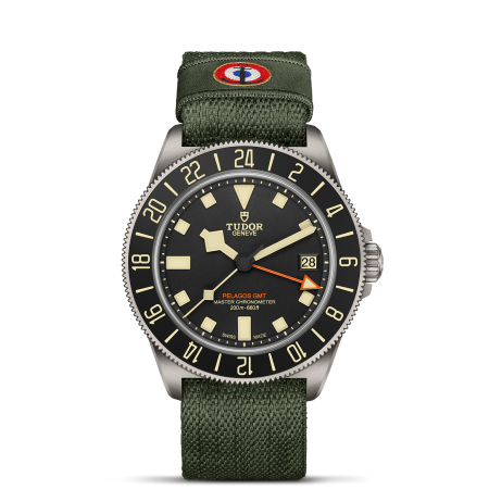 The Pelagos FXD model, where FXD refers to the extra robust fixed strap bars of the case, was developed in conjunction with the French Navy's combat swimmers. This watch features a 42mm titanium and stainless steel case, a black ceramic rotating bezel, a scratch-resistant sapphire crystal and a green textile strap with a red stripe. Its matte black dial is completed with luminescent hands and the watch is water resistant to 200m. An extra black rubber strap with a textile look is included in the package.